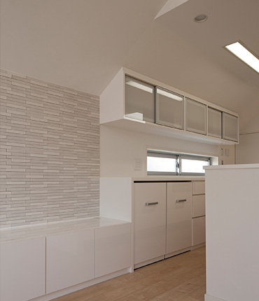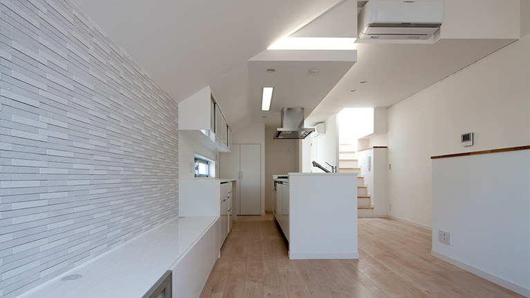清潔感のある明るいリビングと陰影のある壁面タイルをアクセントとした住宅